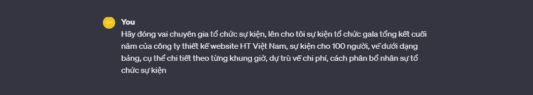 Điều quan trọng là bạn mô tả càng chi tiết càng tốt với yêu cầu của mình và ChatGPT rất thích được đóng vai làm "Chuyên Gia" Nên HÃY GỌI TÔI LÀ CHUYÊN GIA tôi sẽ làm tốt hơn công việc của mình.