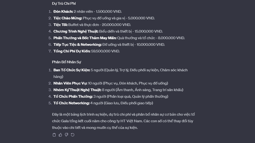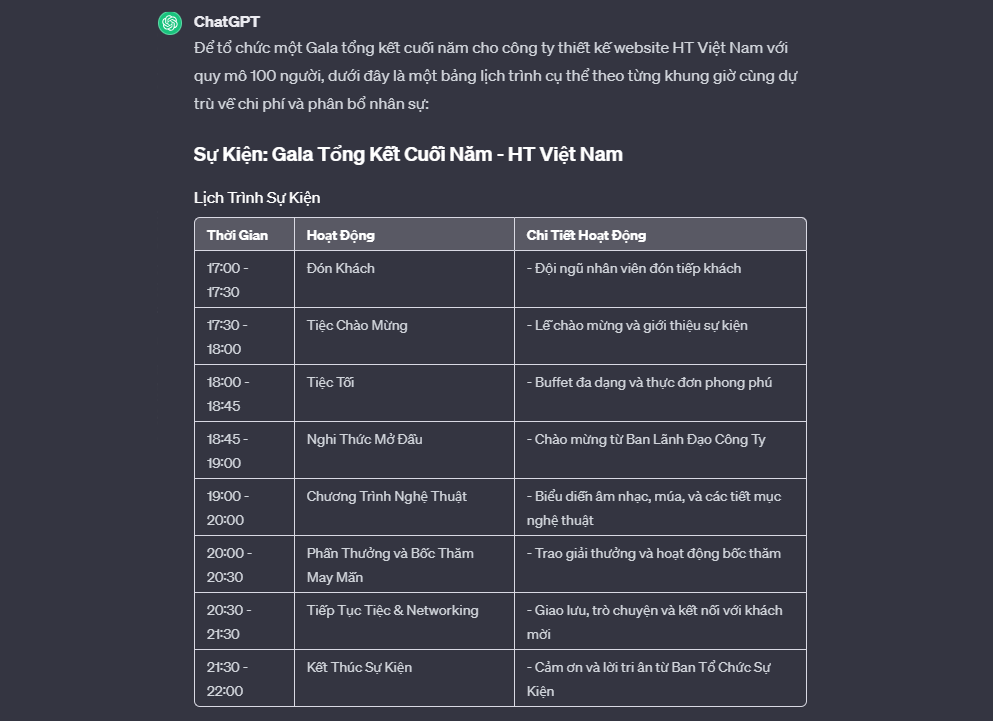 "Hãy đóng vai chuyên gia tổ chức sự kiện, lên cho tôi sự kiện tổ chức gala tổng kết cuối năm của công ty thiết kế website HT Việt Nam, sự kiện cho 100 người, vẽ dưới dạng bảng, cụ thể chi tiết theo từng khung giờ, dự trù về chi phí, cách phân bổ nhân sự tổ chức sự kiện"
